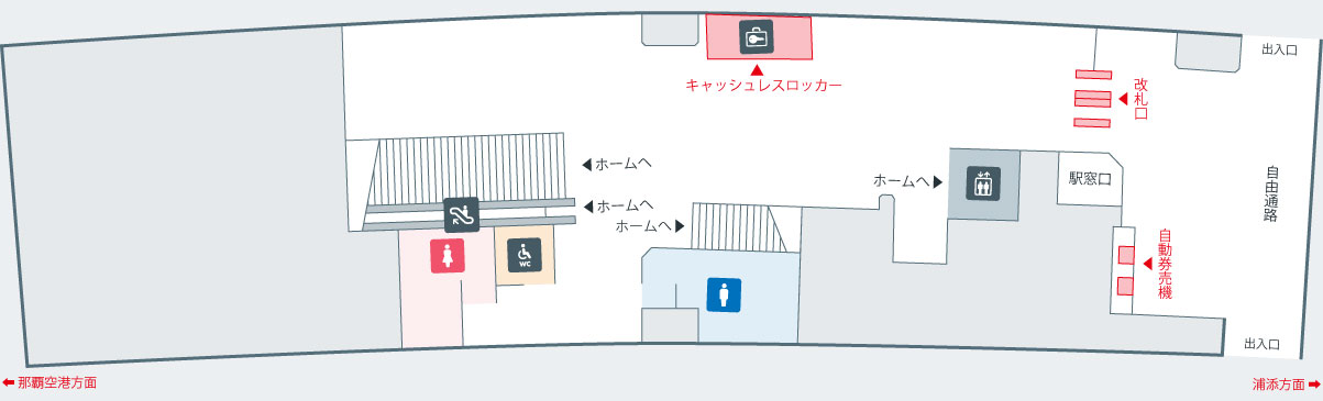 駅舎に沖縄らしさを表現するために、駅にちなんだアートガラスや、沖縄の動植物などをイメージしたアートタイル を設置しています。各駅ごとに違うアートデザインをぜひお楽しみください。